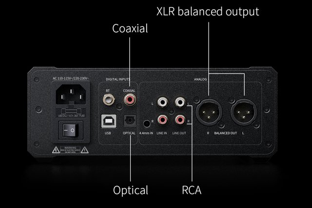 前面にはXLR4ピン、4.4mmバランス、6.35mmシングルエンドのヘッドホン出力端子を各1系統ずつ装備。背面にはUSB-B、4.4mmバランス、RCA、光/同軸デジタル入力と、XLRとRCAの出力端子を各1系統ずつ装備する。さらに側面にはUSB-C端子も備えている。
