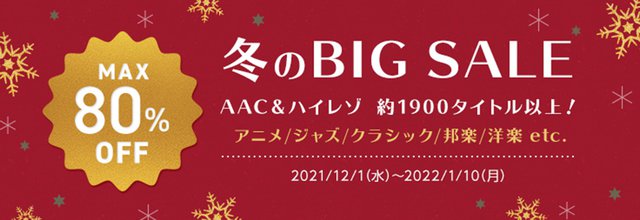 毎年夏/冬恒例で実施していた「ハイレゾプライスオフキャンペーン」とは異なり、ハイレゾ音源だけでなく通常(AAC)音源も対象となる大型セール。実施期間も翌年まで拡大し、「年末年始にお家でゆっくり過ごす時間にも、様々なジャンルの音楽をお得にお楽しみ頂ける」としている。