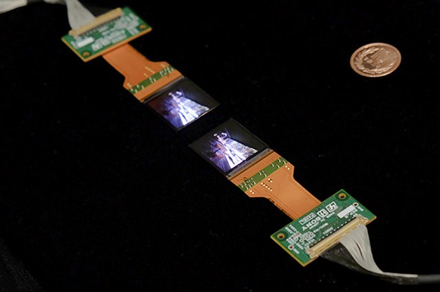 この高精細な映像表示を可能にしているのが、1インチクラスで4K解像度を実現したという「4KOLEDマイクロディスプレイ」だ。会場ではディスプレイそのものも展示されていた。近くに十円玉が置かれていたが、近しいサイズ感の小さな画面の中に、非常に高精細な映像が映し出されていることが肉眼でもよくわかる。