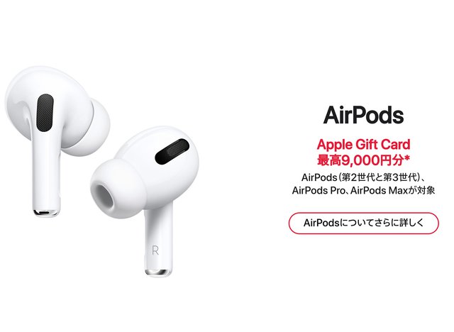 AirPodsは第3・第2世代、AirPods Pro、AirPods Maxを購入すると、最高9,000円分のAppleギフトカードがもらえる。