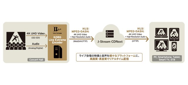 配信システムには、動画ソリューションを各社に提供するJストリームのCDN「J-Stream CDNext」と、コルグが開発した動画配信システム「Live Extreme」とを組み合わせて使用。4K映像やハイレゾ音声での配信にも対応し“業界史上最高音質”を謳うLive Extremeを使用することなどで、今回の4K/ロスレス5.1chサラウンド配信を実現した。