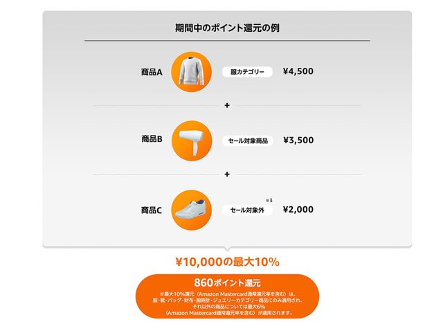 期間中にAmazonで合計1万円以上の買い物を行うと、プライム会員なら+2%、Amazonショッピングアプリでの買い物で+1%、Amazon Mastercardでの買い物で最大3%のポイントが還元される。さらに服や靴、バッグ、財布、腕時計、ジュエリーの各カテゴリーの商品を購入すると、4%の追加ポイントが還元される。