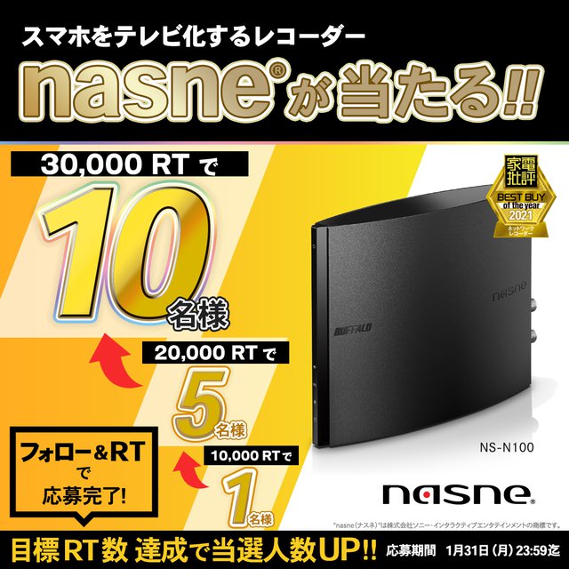 本キャンペーンではリツイート数に応じて当選者数が決定する仕組み。期間中、バッファロー公式Twitterアカウント(@BUFFALO_melco)をフォローの上、対象ツイートをリツイートした方を対象に、抽選で最大10名にバッファロー製「nasne」がプレゼントされる。