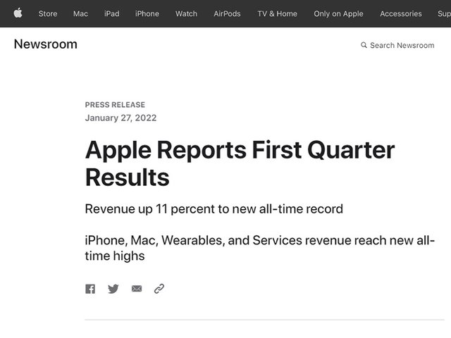 米Appleは、2022年度第1四半期(2021年10月-12月)の決算を発表。売上高が1,239億ドル(約14兆3,000億円)となり、過去最高の売上を達成した。