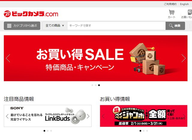 2月20日(日)23時59分までの2日間限定で、対象商品のポイント還元率をアップ。指定のおもちゃ(テレビゲーム類を除く)・くすり・化粧品・日用品・モバイルバッテリーが、通常ビックポイントよりさらに5%ポイントアップするほか、電球・電池・電源タップは全品が5%ポイントアップになる。また、ワイン、スパークリングワインを全品5%引きにしている。