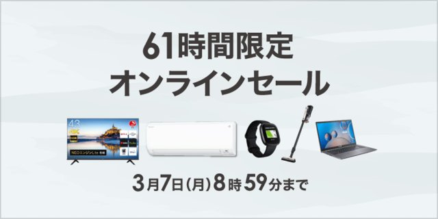 ビックカメラ・ドットコムは、「61時間限定オンラインセール」を開始した。AV機器などで日替わり特価品を用意するほか、Apple Watch Nike Series 6の1万円オフクーポン配信なども行っている。セール期間は3月7日(月)午前8時59分まで。