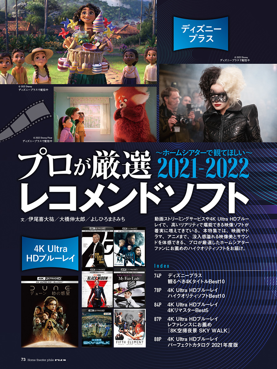 第2特集は「プロが厳選 レコメンドソフト 2021-2022」と題した2021年度のコンテンツ事情を振り返る特集です。動画ストリーミングサービスや4K Ultra HDブルーレイで、高いリアリティで堪能できる映像コンテンツが着実に増えてきています。本特集では、ディズニープラスで配信されている作品、Ultra HDブルーレイソフトのなかから、没入感溢れる映像美とサウンドを体感できる作品をプロが厳選。2021年度に国内で発売されたUltra HDブルーレイを網羅したカタログもぜひお役立てください。