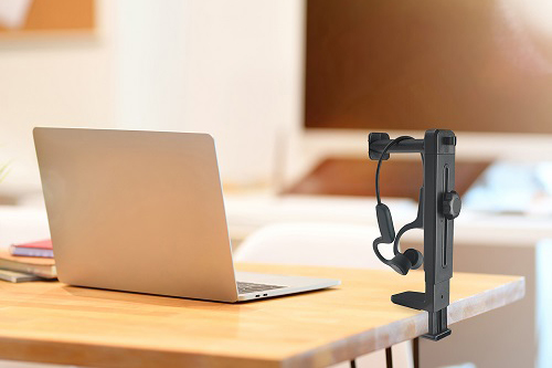 ゲオ、デスクに挟むだけで取り付けられるヘッドホンフック。360度回転式、スタンド利用も可