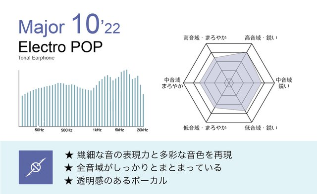 Chord&Majorは、エレクトロポップ向けイヤホン「Major10’22 Electro Pop」を4月15日より発売する。価格は24,680円(税込)。