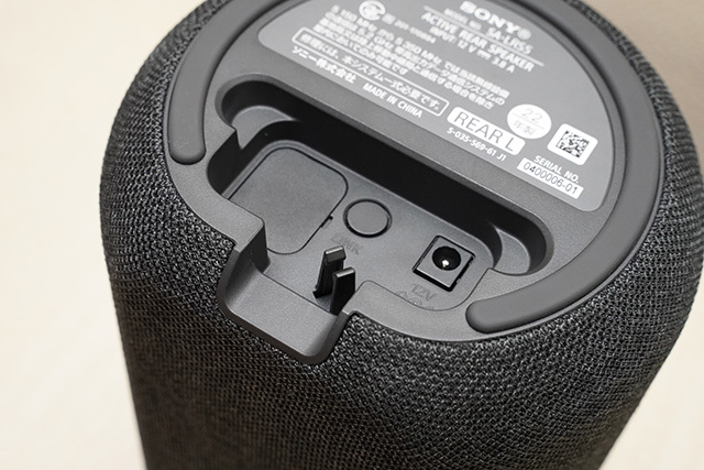SA-RS5はHT-A9と似たデザインをしているが、本機のほうが小型で、前述のようにバッテリーも内蔵する点などが違い。外形寸法は145W×250H×134Dmm。充電用のACアダプター2つが付属し、もちろんACアダプターで電源に接続しながらの使用も行える。