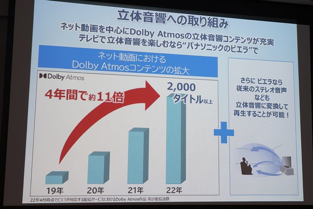 また、音声ではDolby Atmosに対応しており、今回発表の4Kビエラは有機EL/液晶の全モデルがDolby Atmos対応となる。同社は近年、Netflixなどネット動画を中心にDolby Atmosコンテンツが増えてきていることから、「テレビでアトモスコンテンツを楽しむならビエラが最適」だとアピールする。