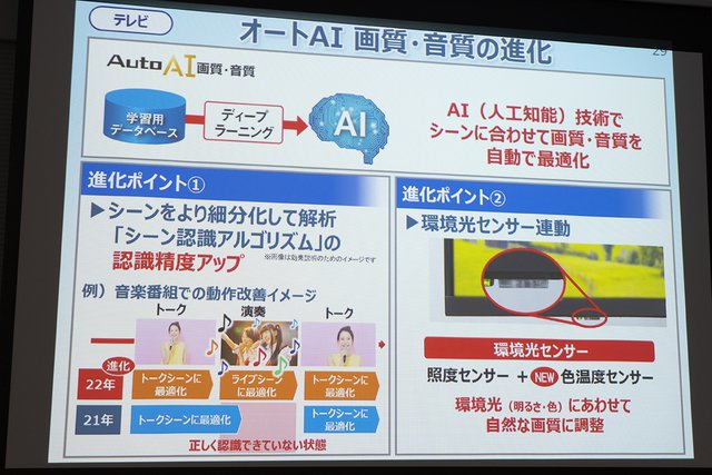 映像のジャンルやシーンに応じて画質・音質を最適化する「オートAI画質・音質」も進化。「シーン解析アルゴリズム」の精度がアップし、シーンをより細分化して解析するようになったほか、光に合わせて画質を調整する「環境光センサー」は、これまでの照度センサーに加えて色温度センサーを新搭載している。加えてNetflix画質モードにも照度センサーの情報が反映されるようになっている。