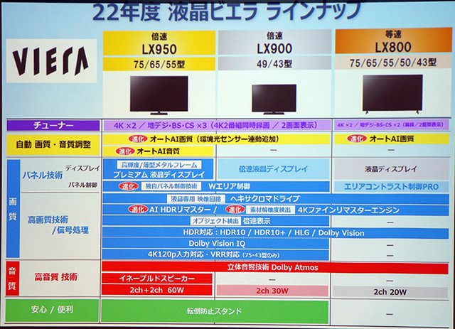 同社4K液晶テレビのスタンダードモデル。「オートAI画質」を始めとする高画質化機能を2021年モデルよりも進化させつつ、液晶パネルを倍速対応ではなく等速のものにするなどで、先行して発表されている上位機「LX950シリーズ」「LX900シリーズ」よりも価格を抑えている。