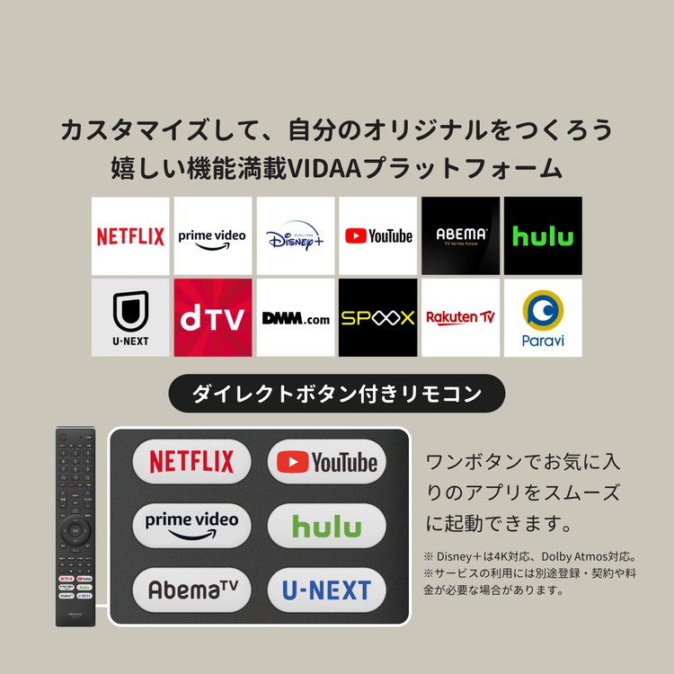 独自プラットフォーム「VIDAA」を採用し、ホーム画面のカスタマイズが可能。リモコンには6つのVODサービスを呼び出せるダイレクトボタンを備える。ほか、ゲームプレイを低遅延で楽しめるゲームモードが搭載される。