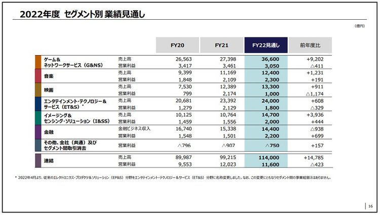 セグメント別では、「ゲーム&ネットワークサービス(G&NS)」分野は、ハードウエアの収益性改善等により、売上高は前年度比835億円増の2兆7,398億円、営業利益は同44億円増となる3,461億円と増収増益。2022年度はBungie、HAVENのスタジオ買収など、さらなるコンテンツ開発力強化に注力。売上高は3兆6,600億円の大幅増収を見込む一方、ゲームソフトウェアの開発費増に伴うコスト増や買収費用の計上で、411億円の減益を見込む。