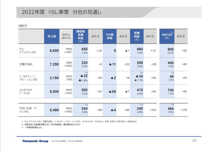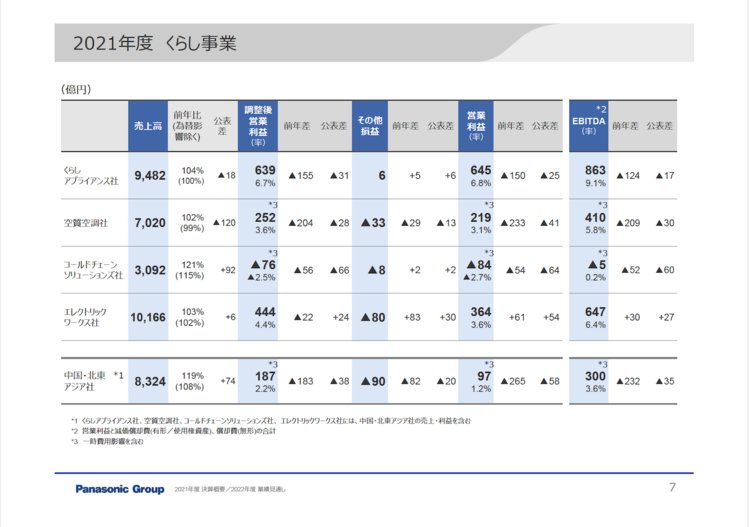 くらし事業詳細では、くらしアプライアンス社は、中国・アジアで洗濯機・冷蔵庫などの増販があったが、日本の巣篭もり需要の反動での減販損、原材料・物流費の高騰で減益となった。