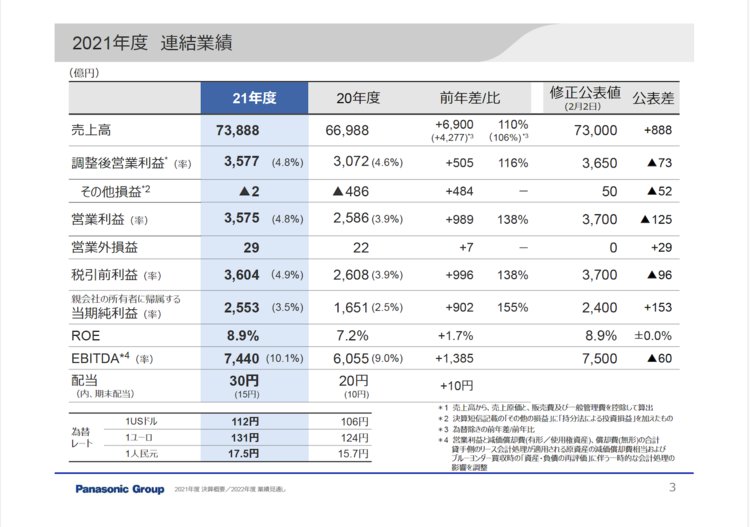 パナソニックホールディングス(株)は2021年度の決算概要と2022年度の連結業績見通しについて説明会を開催、同社取締役 副社長執行役員 グループCFOの梅田博和氏が説明を行なった。