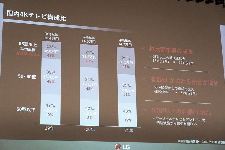 本日5月19日、LGは都内にて2022年テレビ新製品発表会を実施した。同社の2021年の有機ELテレビ世界出荷台数は約400万台となり、過去最高を記録。世界販売シェアも62.0%と伸長、有機ELテレビ購入者のうち「6人に1人がC1シリーズを購入」している状態だという。