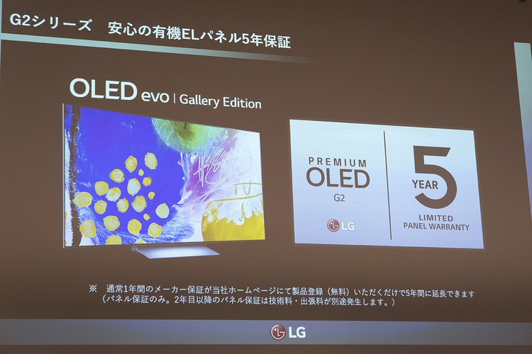 さらにOLED G2では、新たに有機パネル5年保証のサービスを開始する。メーカー保証は通常1年間となっているが、ホームページから無料の製品登録をすることで5年に延長できるというもの。保証されるのはパネルのみで、2年目以降は技術料・出張料が別途発生するとのこと。