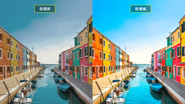 映像エンジンとして、最高クラスの映像美を追求し、映像処理の総合力を引き出すという「AlgoエンジンMAX」を搭載した。文字周辺とエッジ部のノイズ処理以外にも、映像の平坦部における波線のようなノイズを最大限抑制し、HDや2Kの映像を4Kへとアップスケーリングする。