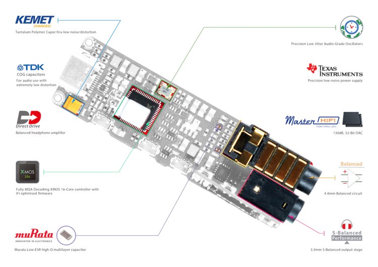 出力はバランス時で475mW@32Ω/7.2V@600Ω、シングルエンド時で300mW@32Ω/3.8V@600Ωと、高インピーダンスなヘッドホンでも駆動可能とアピールする。出力インピーダンスは1Ω以下だが、高感度IEMに合わせて出力を減衰させ、バッググランドノイズを除去してボリューム調整範囲を広げる「IEMatch」や、ゲインを6dBブーストさせる「ターボモード」といった2つのパワーチューニング技術も搭載している。