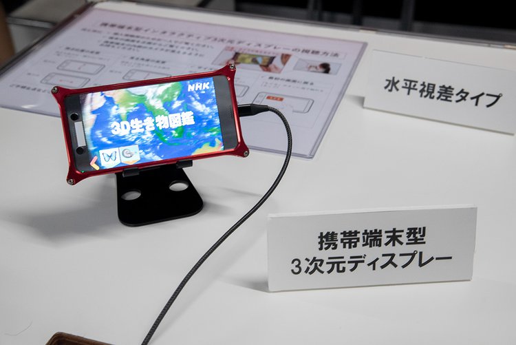 そのほか、HMDや、グラスといったウェアラブルデバイスを介さない立体視技術として、「携帯端末型インタラクティブ3次元ディスプレイ」が展示。会場には、横画面固定だが映像の品質を高めた「水平視差タイプ」と、画面の向きに依存せず任意の方向から視聴できる「全方向視差タイプ」の2パターンが用意された。