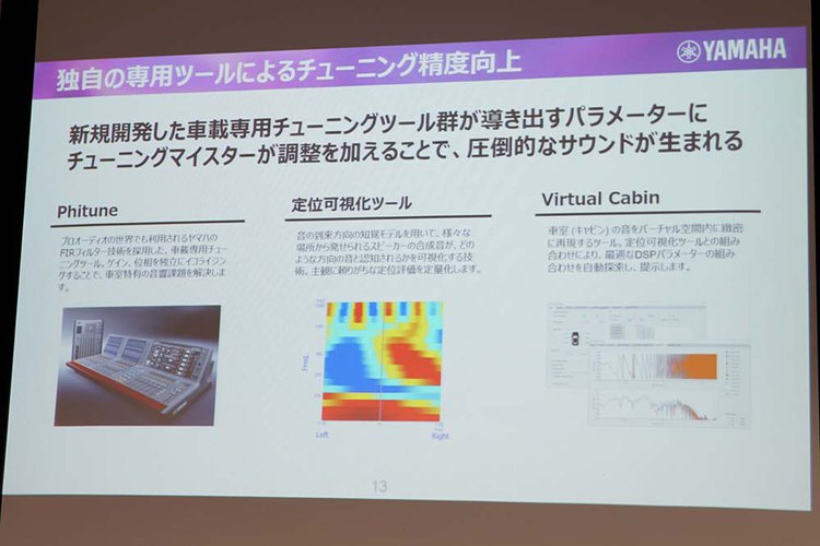 こうしたオーディオ体験は、あくまでメーカーに対して「ヤマハとしてはこういったことができますよ」と説明するデモのために用意されたものであり、採用するかどうかはメーカー側の判断となる。また車種に応じたチューニングを行う特性上、カスタムパーツとしてカーオーディオショップに並ぶことも難しいだろう。