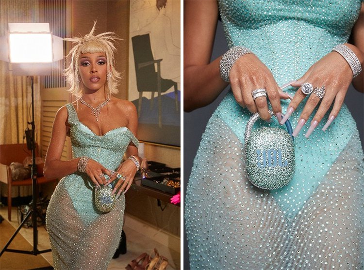 2022年4月に開催された第64回グラミー賞では、最優秀ポップ・デュオ/グループ・パフォーマンス賞を受賞。授賞式当日、華やかなドレスアップでレッドカーペットに現れたドージャは、オリジナルで大胆にデコレーションしたポータブルBluetoothスピーカー「JBL CLIP 4」を装着したハンドバッグを手に持っていた。