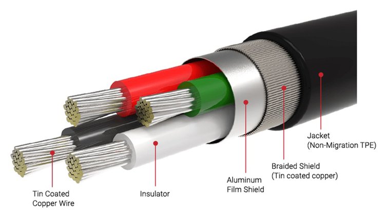 さらに、銅芯線に錫コーディングを施すことで、腐食防止と引っ張り力を強化し耐久性を高めたほか、ケーブル全体をアルミフィルムで包んで錫メッキ銅線を編みこんだことで、ノイズによる音への干渉を極限まで抑制するとのこと。