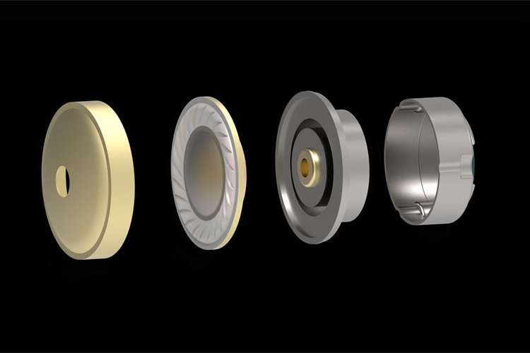 機構ハウジングにはアルミニウムを採用。音響チャンバーには、アルミニウムやステンレスより硬度の高いチタンを用いることで、共振抑制効果が向上し、ドライバーのレスポンスが高まるという。なお、このチャンバー部は、音響空間を確保するため金属を非常に薄く加工するため、強度維持のためにデザイン性も兼ねて、リブ形状を追加するなどの改善を行っているとのこと。