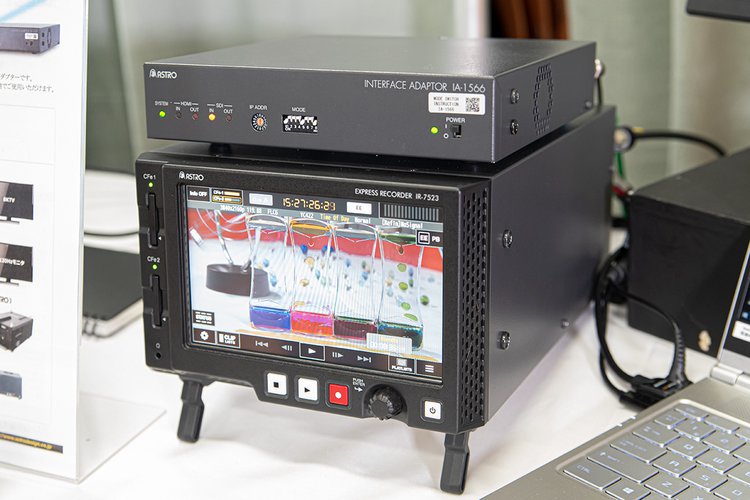 質量3.0kgの小型サイズの筐体ながら4K/120pの映像信号を単体で収録することができるポータブルビデオレコーダー「IR-7523」を展示。記録メディアにCFexpress TypeBカードを採用し、固定1/6圧縮で4K/120pであれば最大20分、4K/60pの映像であれば最大40分の収録に対応する。