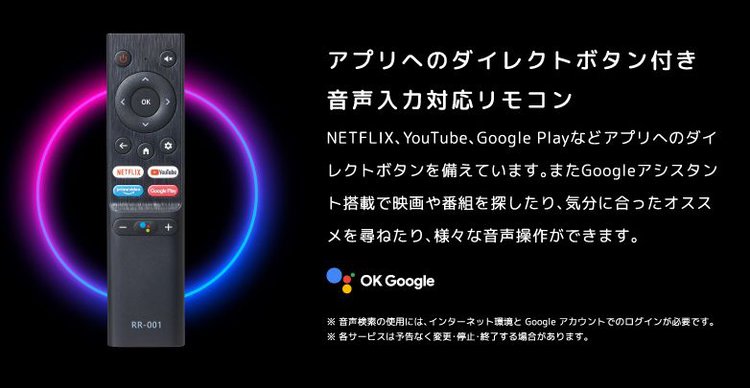 付属のリモコンは共通となる。ボタン数を可能な限り排したシンプルなレイアウトとしつつ、プリインストールする3つの動画サービスについてはダイレクトボタンも装備する。またGoogleアシスタント機能を搭載し、マイクボタンを押すことで、音声でコンテンツの検索や製品のコントロールも可能だ。