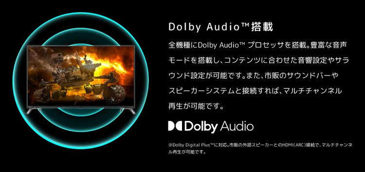 2基のフルレンジスピーカーユニットを搭載し、音声処理エンジンにはDolby Audioプロセッサーを採用。コンテンツに合わせて選択できる豊富な音声モードも備えている。Dolby Digital Plusに対応し、HDMIのARC機能やデジタル音声出力端子から、市販のサウンドバーやスピーカーシステムと接続することでマルチチャンネル出力も可能となる。