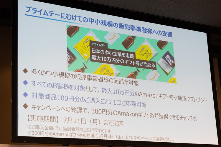 中小規模の販売事業者の対象商品を購入することで、最大10万円分のAmazonギフト券が抽選でプレゼントされる。