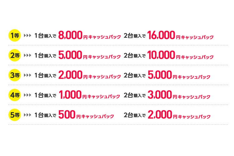 キャッシュバック金額は対象モデルに準じたものではなく、製品購入前にエントリーサイトからLINE認証、友だち登録を行うことで参加できる抽選により決定される。当選金額は対象モデル1台購入時、2台購入時の額が設定されており、最大で1台購入時8,000円/2台購入時16,000円となっている。購入対象製品は下記の通り。