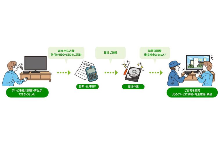 外付けHDD/SSDに録画していたテレビ番組が再生できない、HDD/SSDの電源が入らないといったトラブルが発生した場合に、トラブルの起きたメディアを同社で預かり、録画データを取り出して新しいメディアに復旧するサービス。