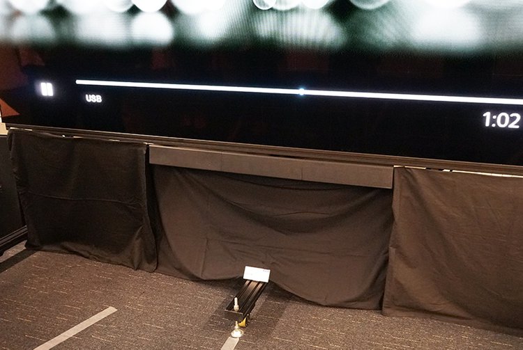 デモ試聴では、大画面ディスプレイによる広い視聴エリアを想定した、画面定位と指向性の制御を実施。上下のラインアレイスピーカーを使用した画面定位の試聴では、指定範囲であればどこに立っても均一な音が聞こえ、範囲外に移動すると音圧が下がり音が届く感覚が軽減するのが体感できた。