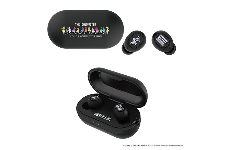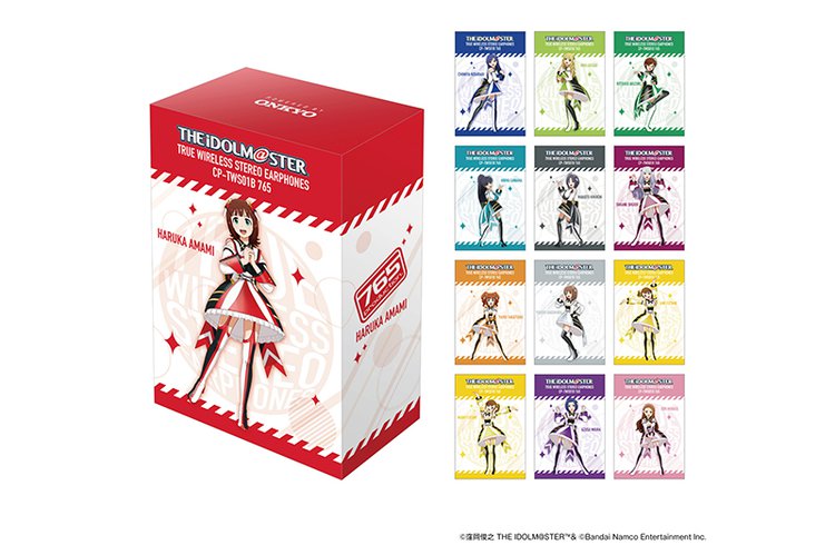 本コラボモデルでは、完全ワイヤレスイヤホン「CP-TWS01B」をベースに、オリジナルデザインを採用。右ハウジングには「765 プロダクションロゴ」、左ハウジングには「エンジェルマーク」を配置し、充電ケースには「アイドル13名のシルエット」を施している。