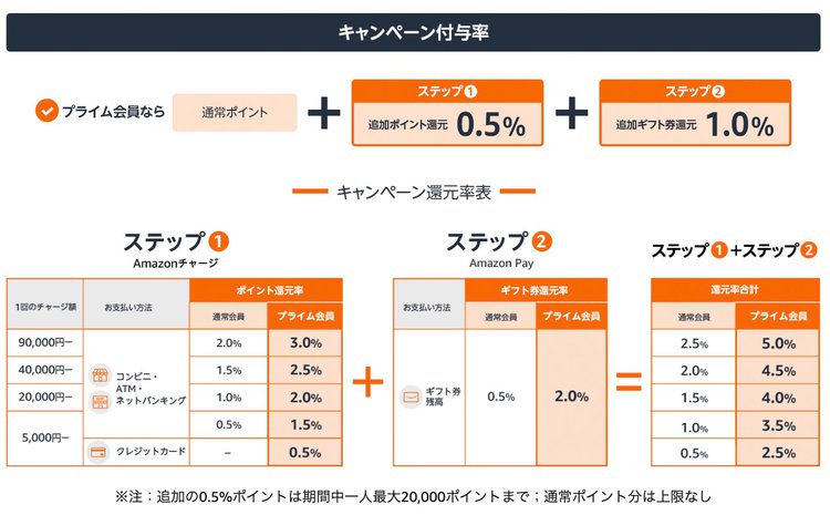 こちらは、プライム会員で、かつコンビニ・ATM・ネットバンキングでチャージした場合が最も還元率が高くなる。チャージ額によって還元されるポイントも変わり、9万円以上チャージすると、最高で3.0%のポイントがもらえる。通常は最高2.5%のところ、プライムデーにあわせて還元率が高まっているのだ。