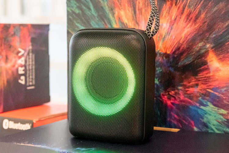 筐体に取手を装備して持ち運びに配慮した“リングLEDキャリングスピーカー”「GRV-BS04LB」(8,480円)は、最大出力15Wのスピーカーユニットを2基装備。上記GRV-BS02LBの入力に加え、さらにUSB入力(サポート最大容量32GB)による音源再生に対応する。連続再生時間は約5時間30分。IPX5の防水性能に準拠する。