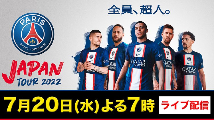 TVerは、TBS系列で生放送予定の「パリ・サン=ジェルマン×川崎フロンターレ」を本日7月20日 19時より配信する。