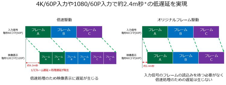 本機能は、60Hzで映像出力するゲーム機とX9900XLシリーズを接続した際、通常は120Hzで駆動する有機ELパネルが、自動的に60Hz駆動に切り替わるというもの。これにより、これまで4K/60Pや1080/60Pの入力信号に対して行っていた倍速処理が不要となり、映像の入力から表示までのレスポンスがさらに向上。映像遅延が従来の約9.3ミリ秒から約2.4ミリ秒まで低減され、さらに快適なゲームプレイが可能になったとしている。