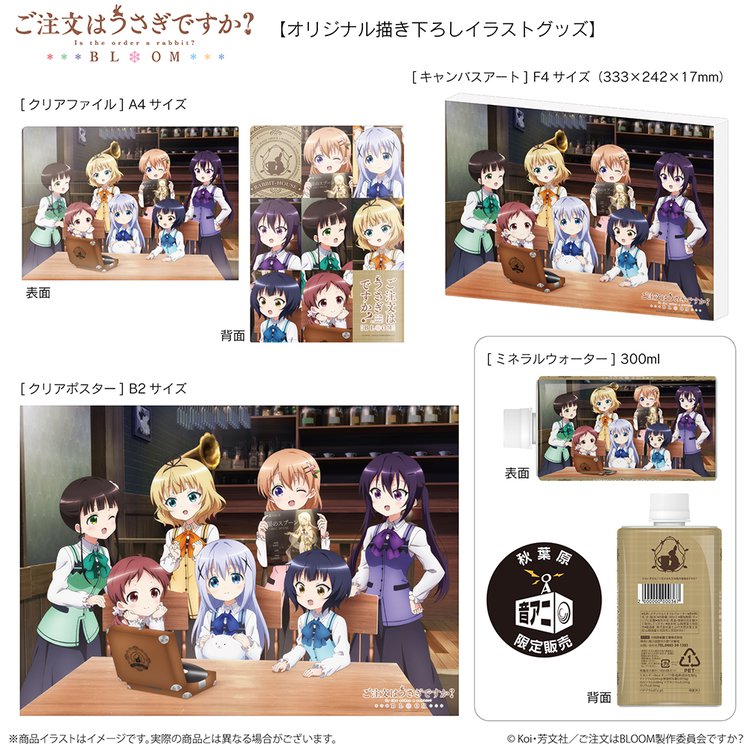 合わせて、描き下ろしイラストデザインを採用した「A4クリアファイル」(税込500円)、「B2クリアポスター」(税込2,500円)、「キャンバスアート」(税込4,500円)、「ミネラルウォーター」(税込350円)を8月5日(金)15時より販売する。なお、ミネラルウォーターのみ音アニ限定商品となる。