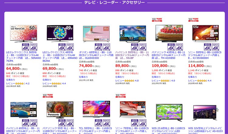 4K液晶テレビは各メーカー製品をラインナップ。パナソニック “4Kビエラ”「TH-43JX850」「TH-55JX900」や、ソニー “4Kブラビア”「KJ-55X8000H」がセール特価となるほか、LG「50NANO76JPA」、ハイセンス「55U8F」などもラインナップしている。AV機器関連ではパナソニックのブルーレイレコーダーなどもセール対象だ。