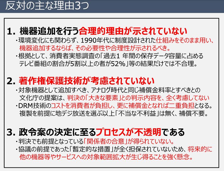 これに対してJEITAは、「社会環境の変化を無視し、20年以上前の古い制度を用いた機器課金という形で消費者に二重負担を強いる政令案は、政策としての合理性が無い」と強く反対。また今後様々な機器やサービスの事業展開を進める上でリスクとなり得るため、重大な懸念を持っているとコメントし、主な反対理由として以下の3点を挙げた。