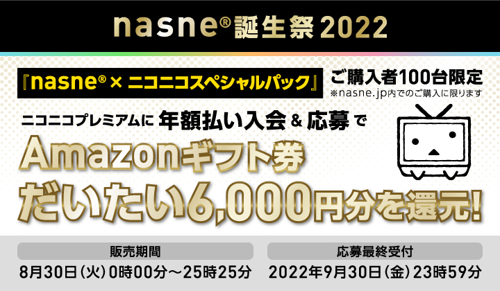 「nasne」購入者に「ニコニコ」プレミアム年会費をAmazonギフト券で還元。100台限定、8/30 0時販売開始