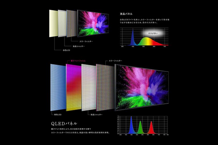 また「55XQDA20」のみ、量子ドット技術を用いたQLEDパネルを採用。青色LEDバックライトを量子ドットフィルムで波長変換する仕組みにより、従来の液晶テレビよりも鮮やかな色彩や、リアルな緑色/赤色が表現可能としている。