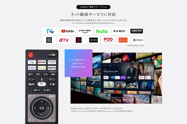 システムにはAndroid TVを採用し、Googleアシスタントによる音声認識や、Chromecast built-inによるスマートフォンやタブレットからの画面共有などにも対応。専用リモコンの上部には、Amazon Prime Video/YouTube/TVer/ABEMA/hulu/U-NEXTの6つの動画サービスへのダイレクトアクセスボタンを搭載している。
