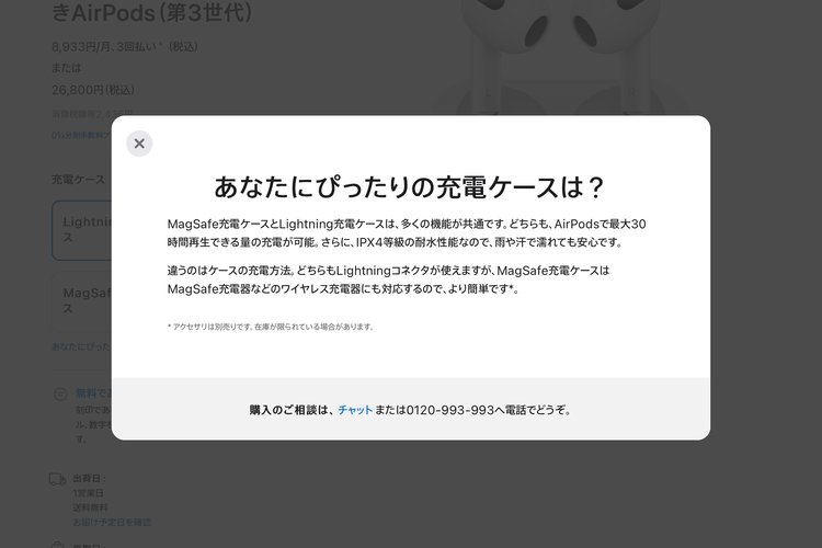昨年より販売されている「AirPods(第3世代)」ではMagSafe対応の充電ケースを採用しているが、新たにLightning充電のみに対応したケースも選べるようになった。