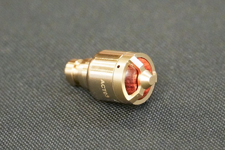 「ACT03」は真鍮と木材を組み合わせた音響チャンバー。Acoustuneの製品/オプション品は多くが金属製だが、今回木材を用いたことで、スピーカーのバッフルプレートのように振動を抑える役割を担うとのこと。今夏開催されたポタ研2022 夏にも出展されていたもので、いよいよ発売の見込みも近い様子。価格はおよそ9万円前後を予定しているという。